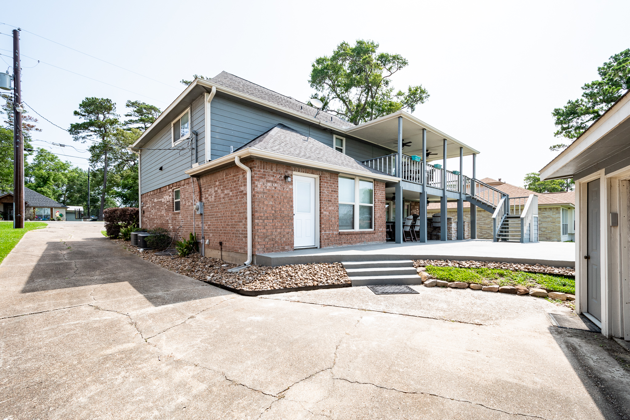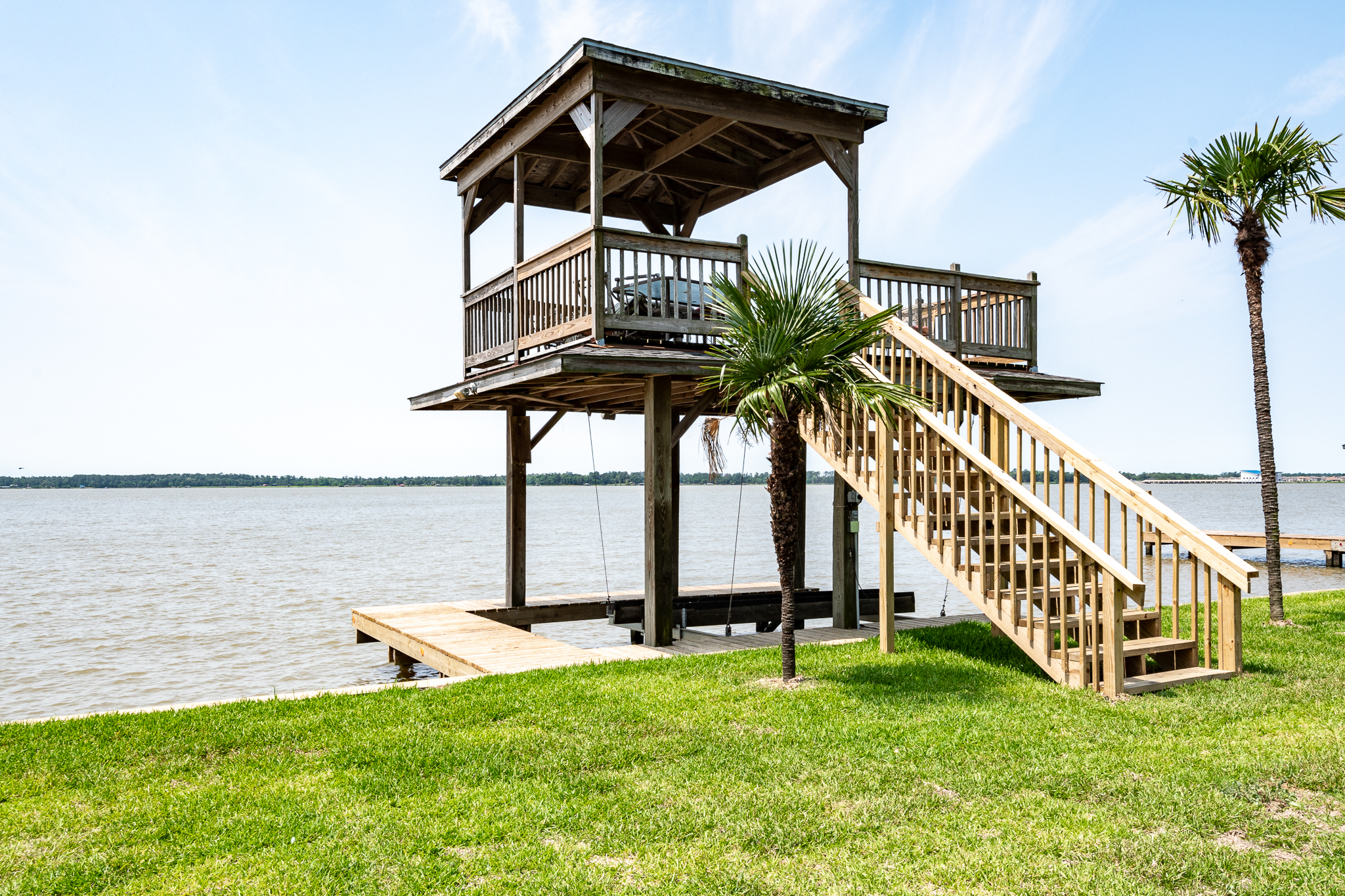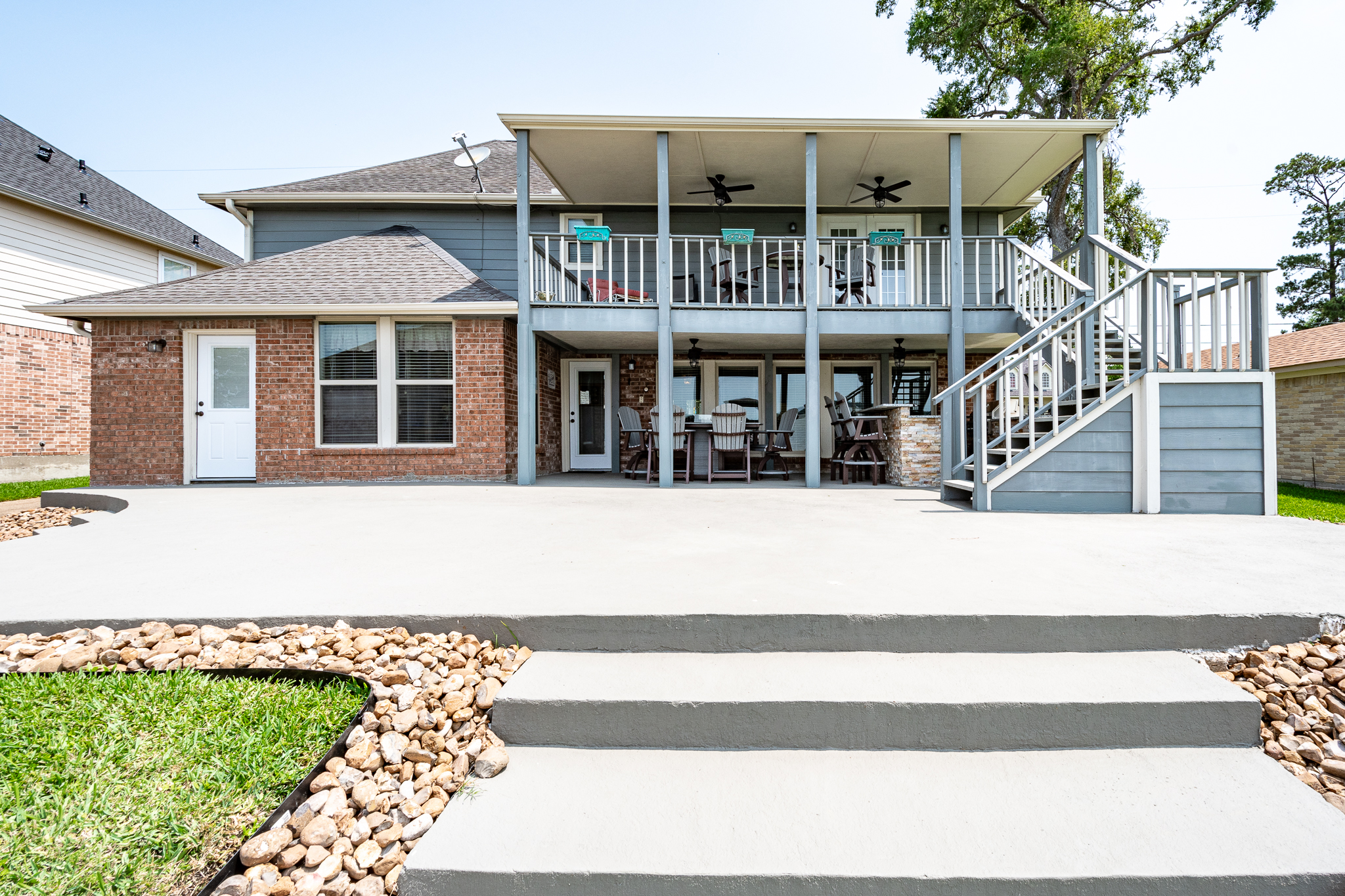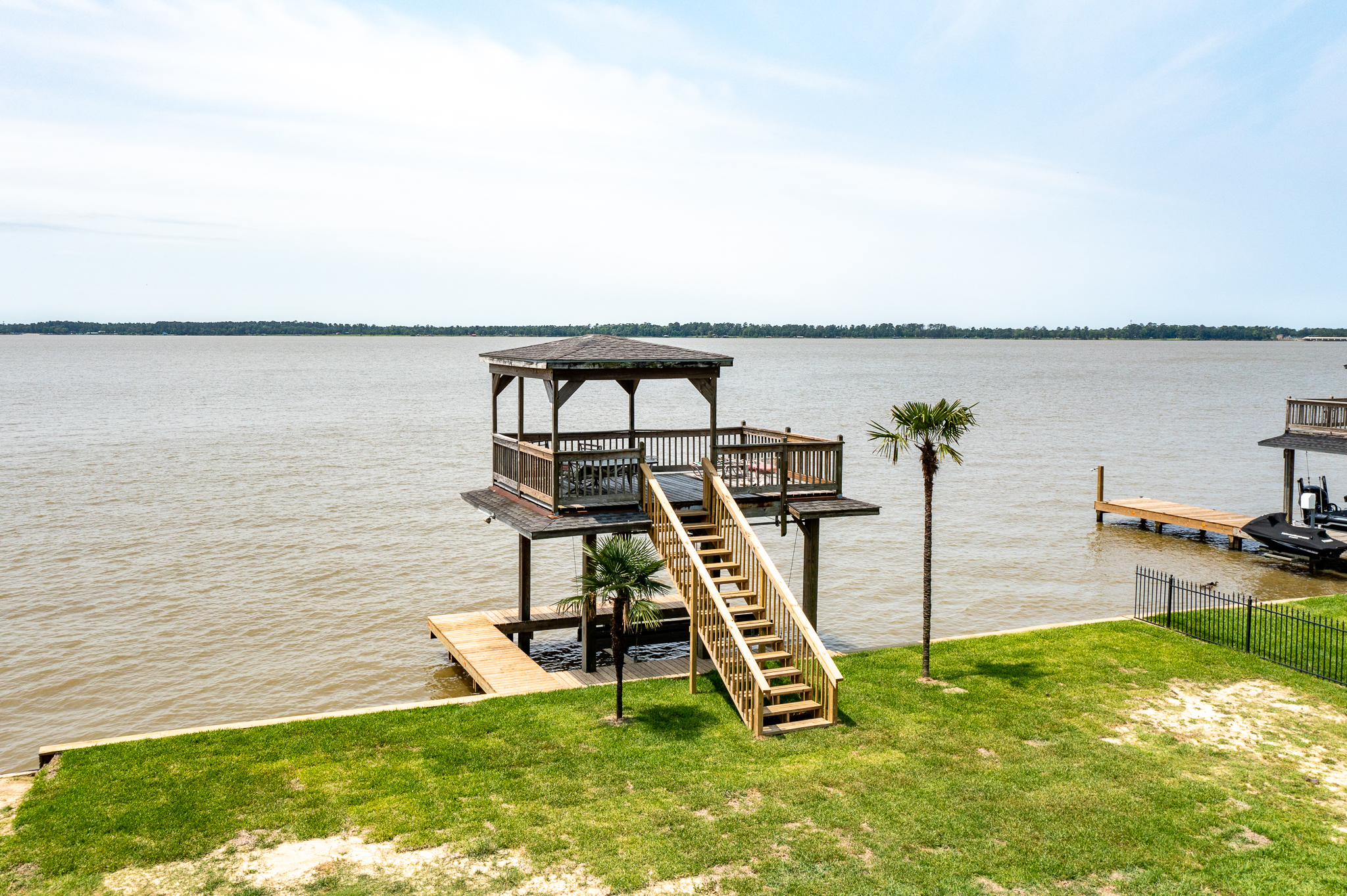 Welcome to your lake front dream home with NO CITY OF HOUSTON TAXES. The home blends comfort with picturesque lake views for your relaxation & enjoyment. Spacious kitchen features under counter lighting, tile back splash, granite counter tops, floor to ceiling cabinets w/soft close doors/drawers, breakfast island & lots of storage space. Large wet bar w/wine cooler, fridge & sink conveniently located between family room & kitchen, great for entertaining. Flex room could easily be used as home office, living room or dining room. Primary bedroom features En Suite Bathroom w/updated counter tops & double sinks. French doors lead to a private 2nd level covered patio, enjoy your morning coffee with a magnificent view of the lake. Step outside to the downstairs covered patio w/new cool deck floor surface & fully equipped outdoor kitchen w/ultimate lakefront views. Stroll down to the recently refurbished boat house w/lift & second floor covered patio area. Bulkhead replaced in 2025.