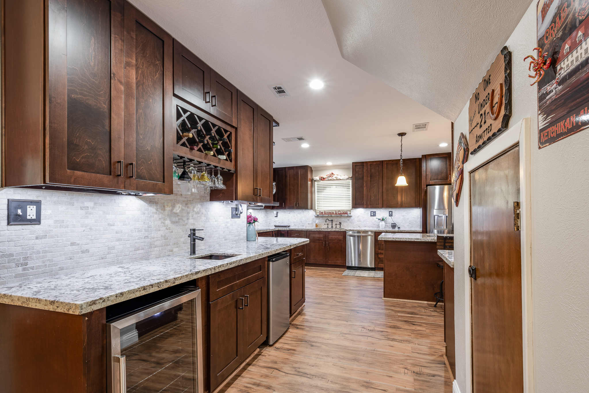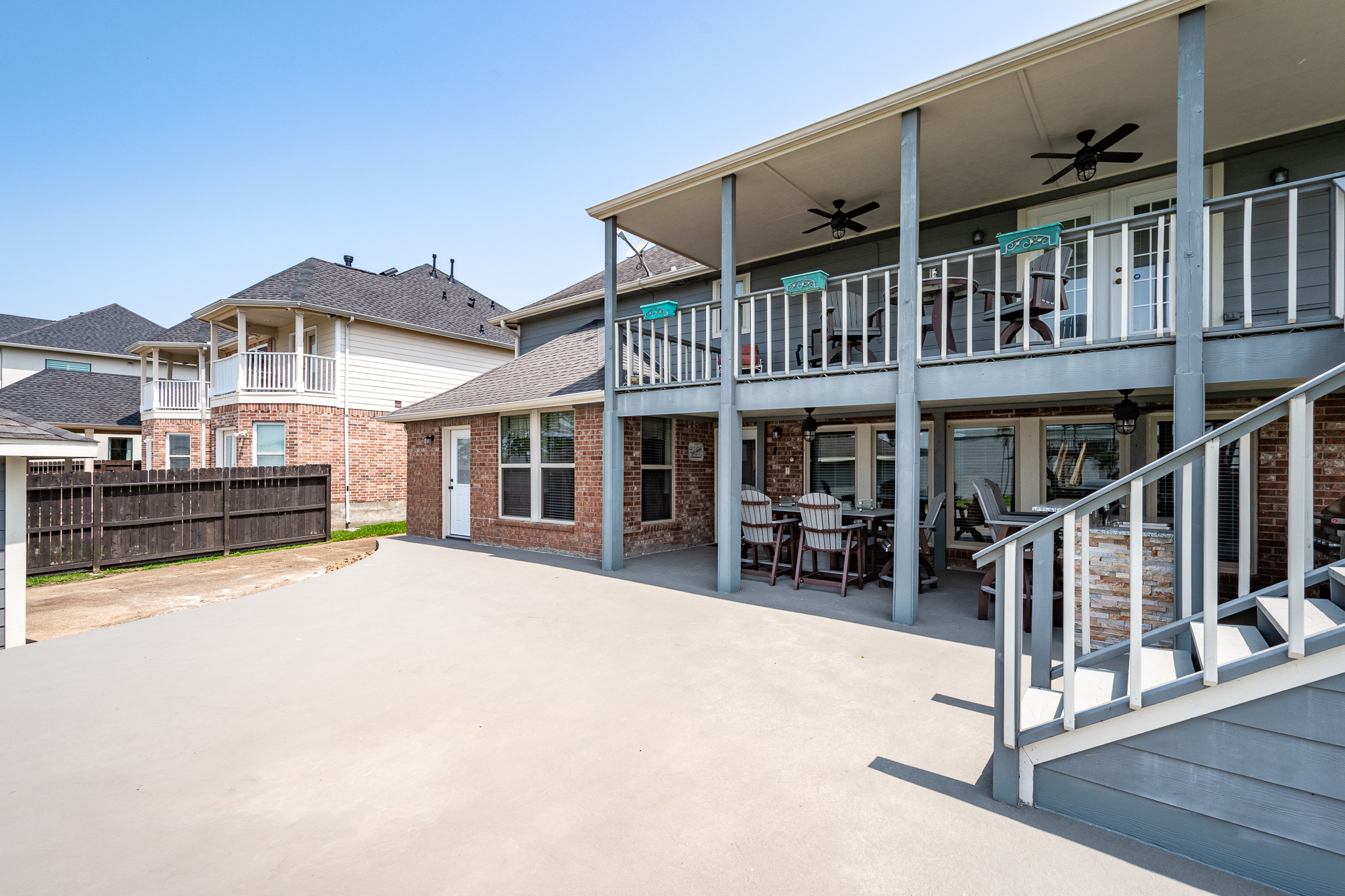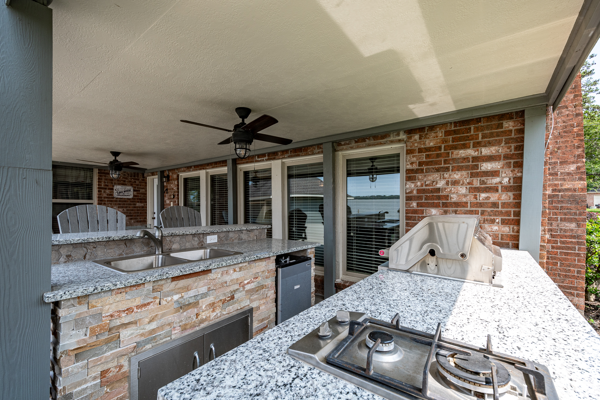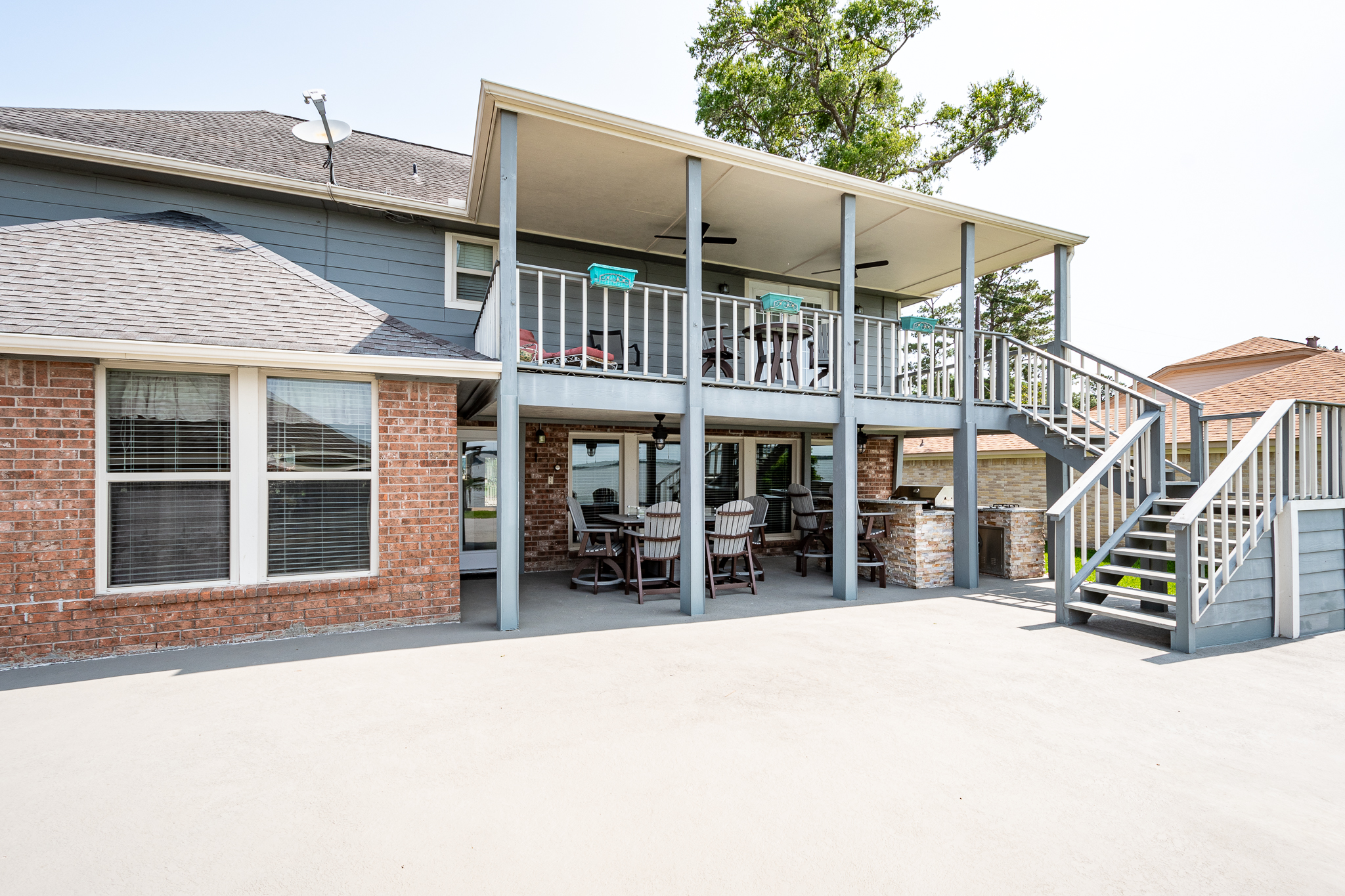 Welcome to your lake front dream home with NO CITY OF HOUSTON TAXES. The home blends comfort with picturesque lake views for your relaxation & enjoyment. Spacious kitchen features under counter lighting, tile back splash, granite counter tops, floor to ceiling cabinets w/soft close doors/drawers, breakfast island & lots of storage space. Large wet bar w/wine cooler, fridge & sink conveniently located between family room & kitchen, great for entertaining. Flex room could easily be used as home office, living room or dining room. Primary bedroom features En Suite Bathroom w/updated counter tops & double sinks. French doors lead to a private 2nd level covered patio, enjoy your morning coffee with a magnificent view of the lake. Step outside to the downstairs covered patio w/new cool deck floor surface & fully equipped outdoor kitchen w/ultimate lakefront views. Stroll down to the recently refurbished boat house w/lift & second floor covered patio area. Bulkhead replaced in 2025.