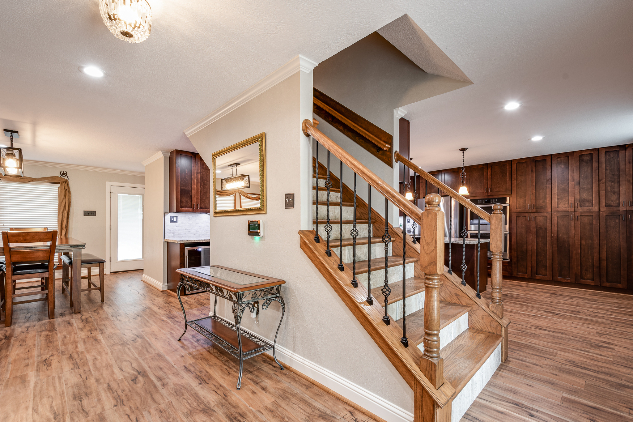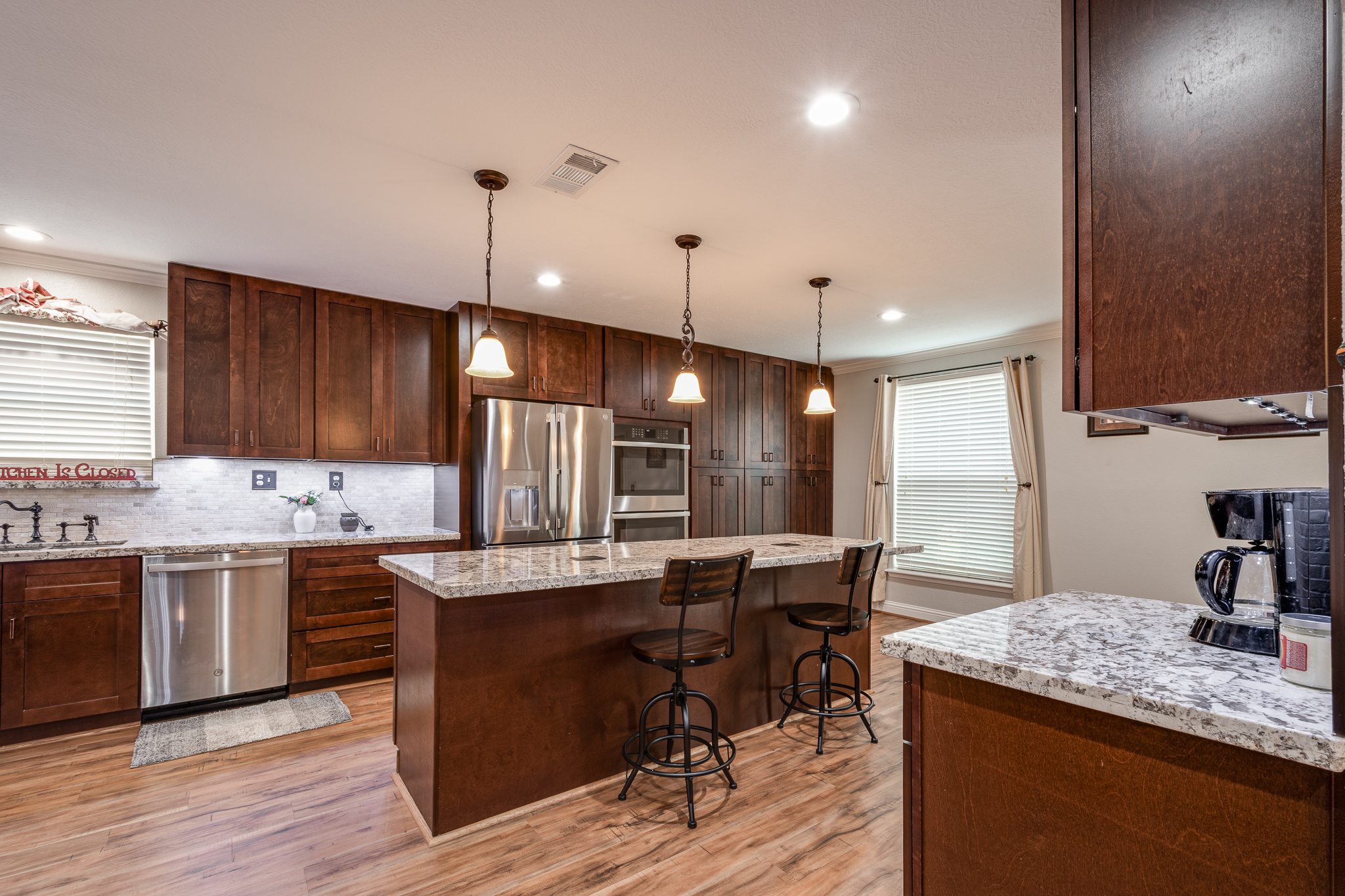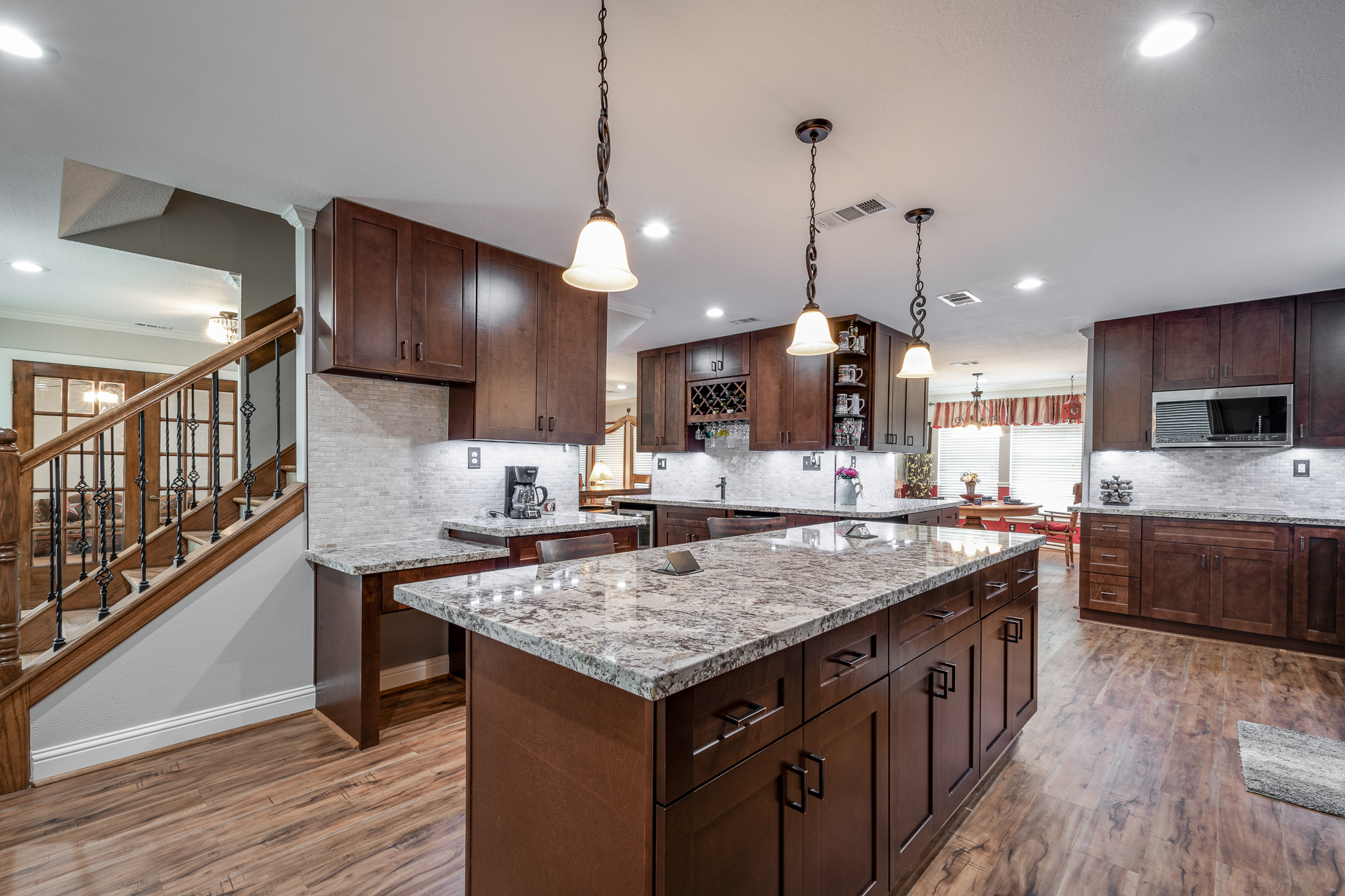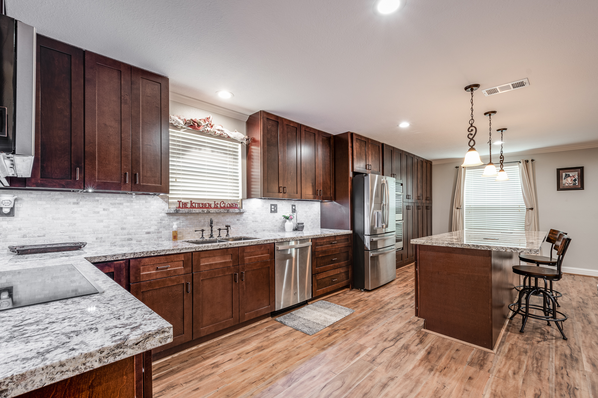 Welcome to your lake front dream home with NO CITY OF HOUSTON TAXES. The home blends comfort with picturesque lake views for your relaxation & enjoyment. Spacious kitchen features under counter lighting, tile back splash, granite counter tops, floor to ceiling cabinets w/soft close doors/drawers, breakfast island & lots of storage space. Large wet bar w/wine cooler, fridge & sink conveniently located between family room & kitchen, great for entertaining. Flex room could easily be used as home office, living room or dining room. Primary bedroom features En Suite Bathroom w/updated counter tops & double sinks. French doors lead to a private 2nd level covered patio, enjoy your morning coffee with a magnificent view of the lake. Step outside to the downstairs covered patio w/new cool deck floor surface & fully equipped outdoor kitchen w/ultimate lakefront views. Stroll down to the recently refurbished boat house w/lift & second floor covered patio area. Bulkhead replaced in 2025.