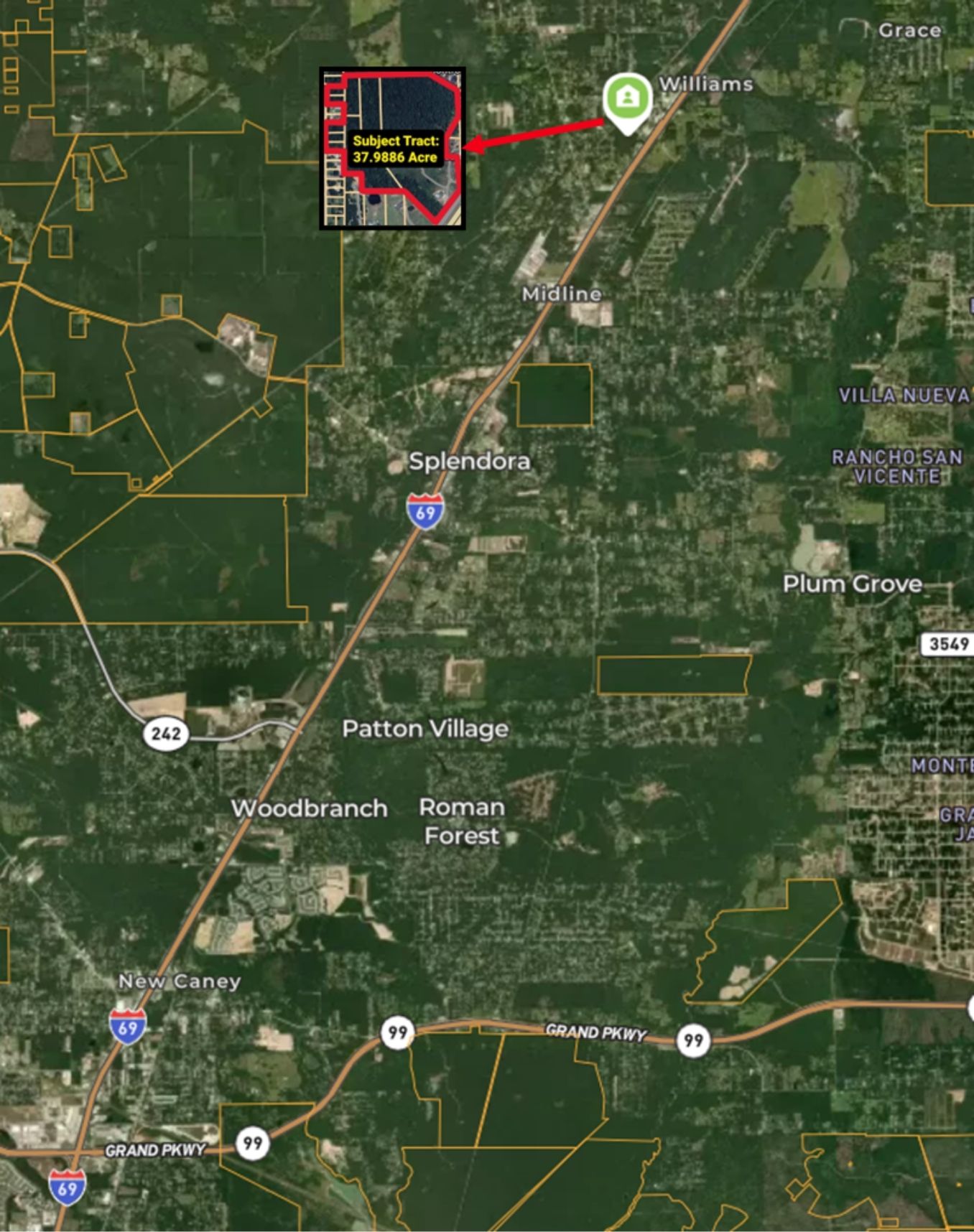 +/- 37.9886 acres of land in high growth area of Cleveland/Splendora. Property has excellent frontage with approximately 486 feet of land fronting US Hwy 59. Easy access to Hwy 105. Property has alternate multi-access through neighborhood – CR 3750 N. 3 Phase power available on site. Ideal use for property include industrial, RV, mixed-use, gas station and retail. Nearby landmarks include Demontrond Ford, retail such as Checkers and Fuel Maxx gas station and industrial including Mustang CAT, Jeff Martin Auctioneers and J-W Power Company. Unrestricted can be commercial or residential (as per owner - please verify).